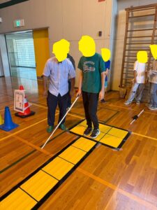 授業では、子どもたちに目かくしをして実際に歩いてもらい、点字パネルの感触を足で確かめる“視覚障がい者体験”をしてもらいました。